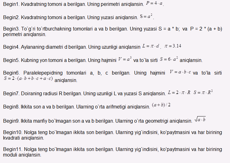 Shu kungacha o'rgangan bilimlar bilan quyidagi misollarni ishlab chiqing. Bu sizni bilimlaringizni mustahkamlashga yordam beradi. Bu misollar ustoz Qudrat Abdurahimovning C++ dasturlsh asoslari kitobidan olindi.